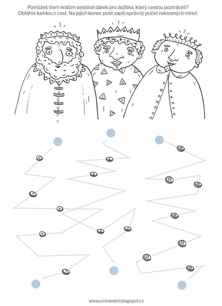 Posbírej penízky pro Ježíška a na závěr udělej tolik puntíků., kolik najdeš na cestě penízků.