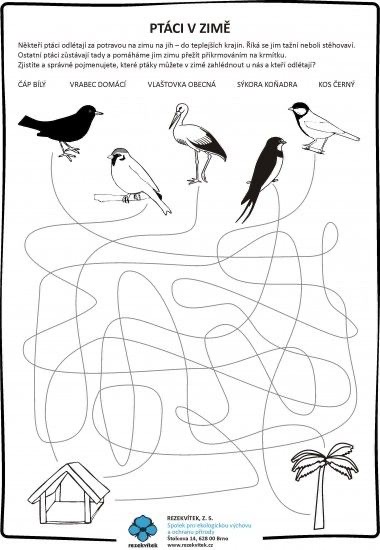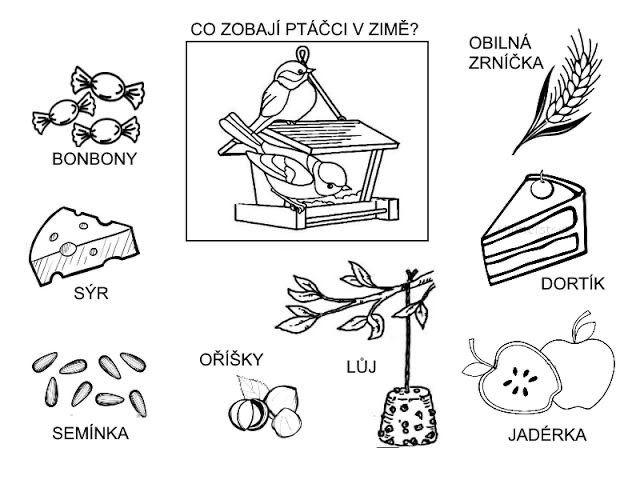 Vybarvi a spoj čarou, co zobají ptáčci v zimě. Co ne, zaškrtni.