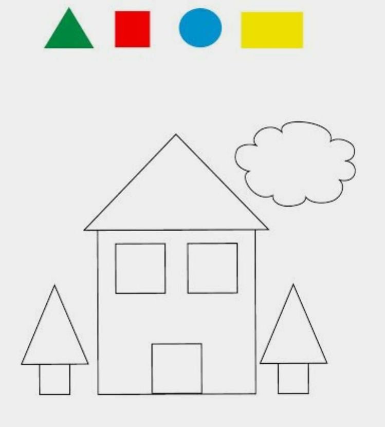 Správně urči geometrické tvary a barvy, které mají a pak domeček dle nich vybarvi.